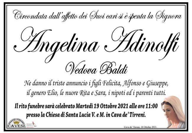 Circondata dall’affetto dei Suoi cari si è spenta la Signora Angelina Adinolfi Vedova Baldi.
