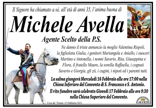 Il Signore ha chiamato a sé, all’età di anni 35, l’anima buona di Michele Avella, Agente Scelto della P.S.