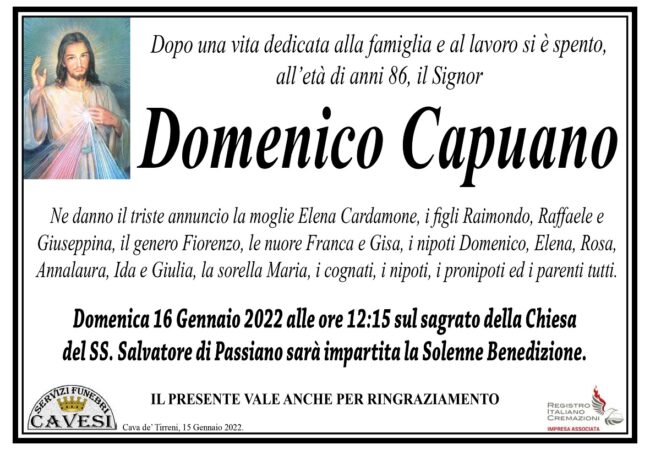 Dopo una vita dedicata alla famiglia e al lavoro si è spento, all’età di anni 86, il Signor Domenico Capuano