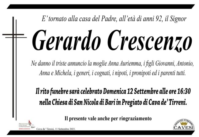 E’ tornato alla casa del Padre, all’età di anni 92, il Signor Gerardo Crescenzo.