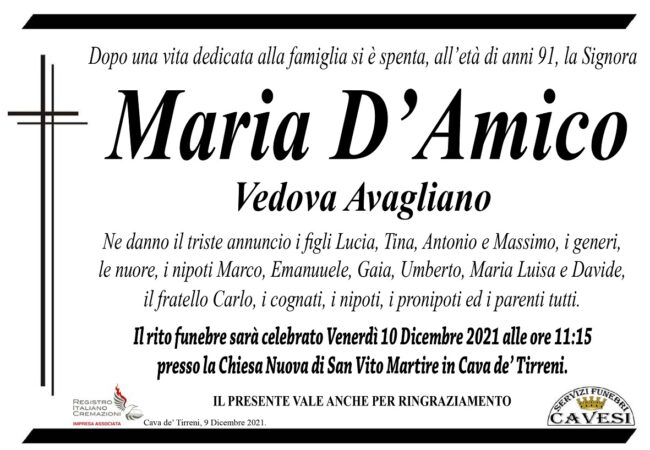 Il rito funebre sarà celebrato domani, venerdì 10 dicembre 2021, alle ore 11:15, presso la Chiesa Nuova di San Vito Martire in Cava de’ Tirreni.