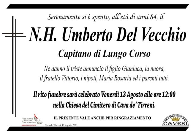 Serenamente si è spento, all’età di anni 84, il N.H. Umberto Del Vecchio, Capitano di Lungo Corso.