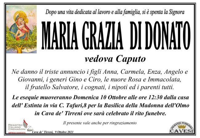 Dopo una vita dedicata al lavoro e alla famiglia, si è spenta la signora Maria Grazia Di Donato, vedova Caputo.