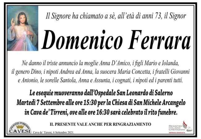 Le esequie muoveranno dall’Ospedale San Leonardo di Salerno oggi, martedì 7 settembre, alle ore 15:30 per la Chiesa di San Michele Arcangelo in Cava de’ Tirreni, ove alle ore 16:30 sarà celebrato il rito funebre.
