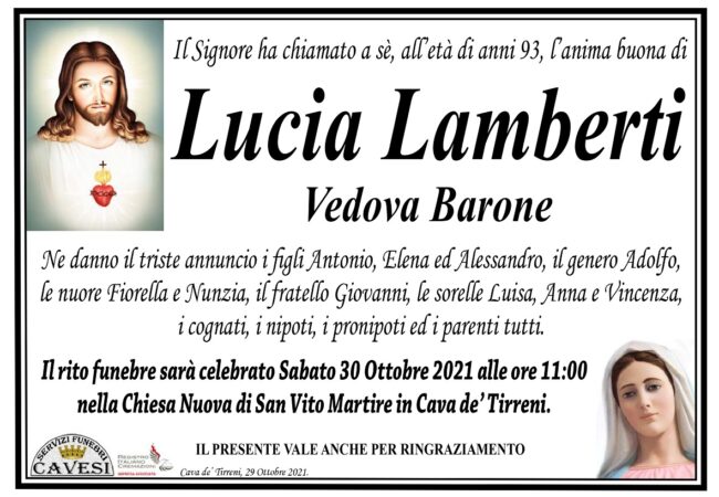 Il rito funebre sarà celebrato stamani, sabato 30 ottobre, alle ore 11, nella Chiesa Nuova di San Vito Martire in Cava de’ Tirreni.