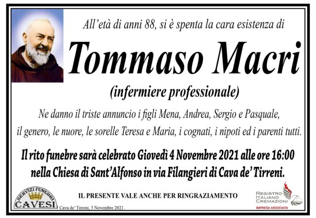 All’età di anni 88, si è spenta la cara esistenza di Tommaso Macri (infermiere professionale).