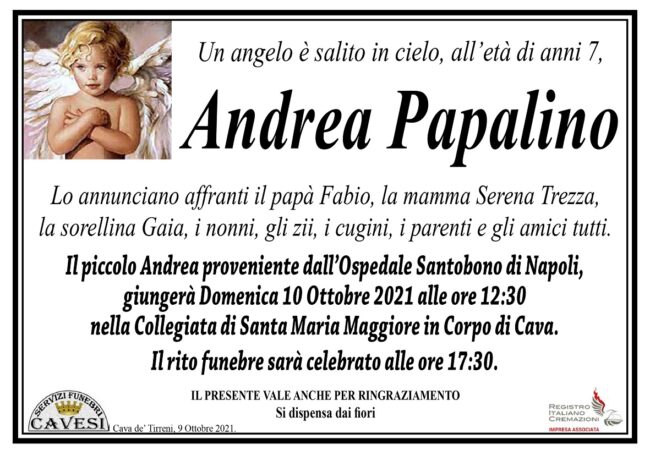 Un angelo è salito in cielo, all’età di anni 7, Andrea Papalino.