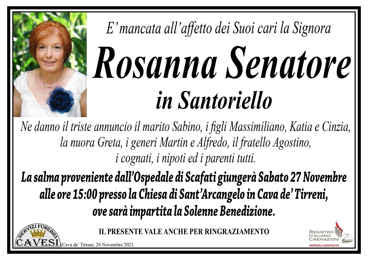 E’ mancata all’affetto dei Suoi cari la Signora Rosanna Senatore in Santoriello.