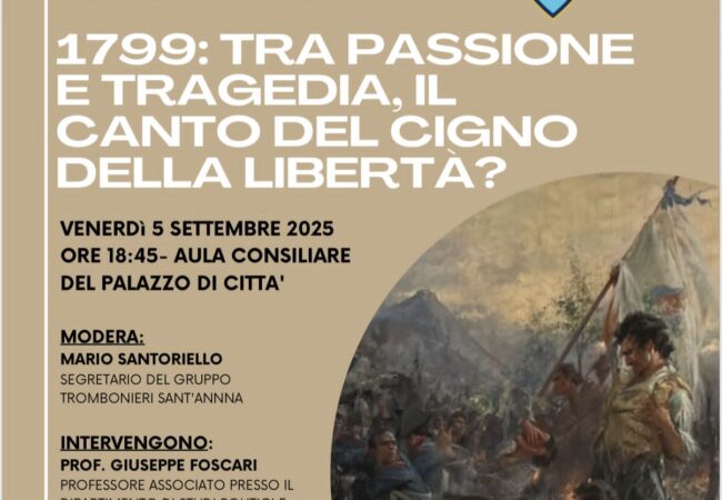 Domani, venerdì 5 settembre, alle ore 18:45, l’Aula Consiliare del Palazzo di Città di Cava de’ Tirreni ospiterà l’incontro “1799: tra passione e tragedia, il canto del cigno della libertà?”, organizzato dal Gruppo Trombonieri Sant’Anna in occasione del cinquantesimo anniversario dalla fondazione.