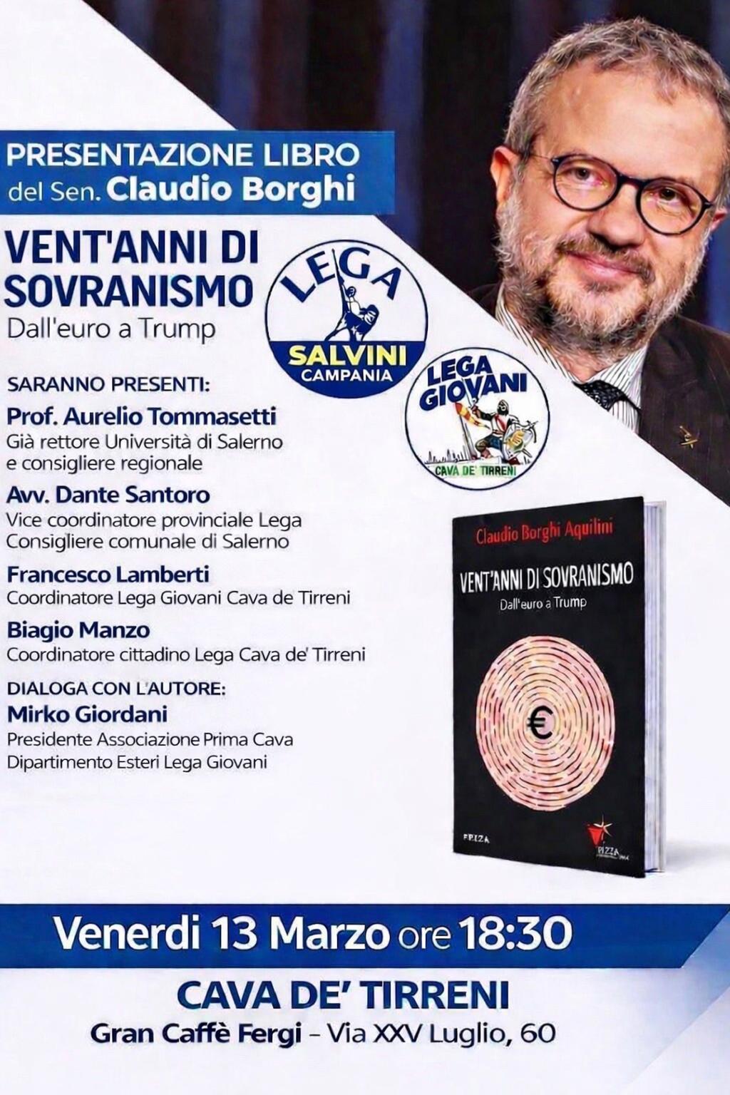 Si terrà venerdì 13 marzo alle 18.30, negli spazi del Gran Caffè Fergi in via XXV Luglio, 60, la presentazione del libro “Vent’anni di sovranismo. Dall’euro a Trump” del senatore Claudio Borghi Aquilini.
