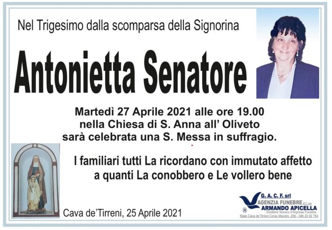 Nel Trigesimo dalla scomparsa della Signorina Antonietta Senatore domani, martedì 27 aprile, alle ore 19, nella Chiesa di S. Anna all’Oliveto sarà celebrata una S. Messa in suffragio.