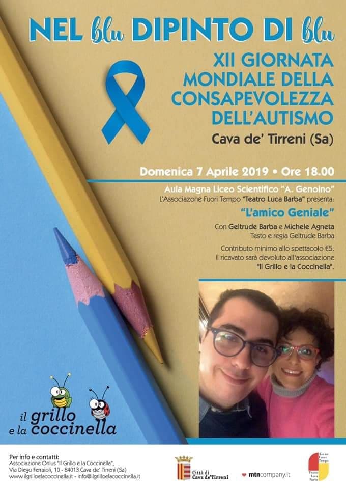 Si intitola “L’amico geniale” lo spettacolo teatrale che andrà in scena domenica 7 aprile presso l’aula magna del Liceo Scientifico “A. Genoino” di Cava de’ Tirreni, alle ore 18. L’opera, ideata e diretta da Geltrude Barba, è presentata dall’Associazione Fuori Tempo “Teatro Luca Barba” e rientra nel cartellone di eventi per la Giornata mondiale per la consapevolezza sull’autismo 2019. Attore “speciale” e compagno di scena della Barba è il giovane Michele Agneta.