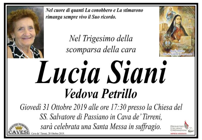 Giovedì prossimo 31 ottobre, alle ore 17,30, nella Chiesa del SS. Salvatore della frazione Passiano di Cava de’ Tirrenii si celebrerà la Santa Messa in suffragio di Lucia Siani, vedova Petrillo, in occasione del Trigesimo dalla scomparsa avvenuta lo scorso 2 ottobre.
