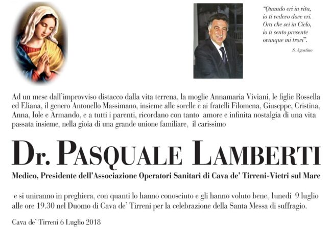 Nel trigesimo della morte del dottor Pasquale Lamberti, verrà celebrata la Santa Messa di suffragio il prossimo lunedì 9 luglio, alle ore 19,30 nella Concattedrale di Santa Maria della Visitazione.