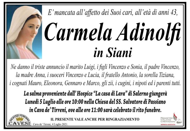 E’ mancata all’affetto dei Suoi cari, all’età di anni 43, Carmela Adinolfi in Siani.