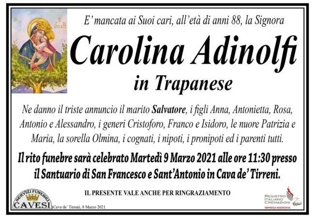 E’ mancata ai Suoi cari, all’età di anni 88, la Signora Carolina Adinolfi in Trapanese.
