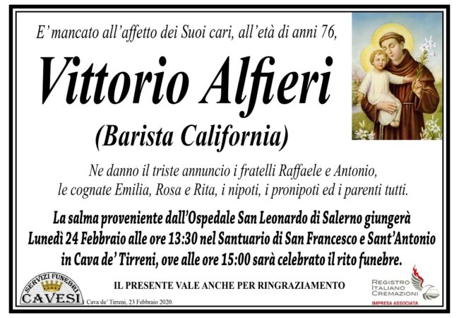 E’ mancato all’affetto dei Suoi cari, all’età di 76 anni, Vittorio Alfieri (Barista California).