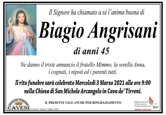 Il Signore ha chiamato a sè l’anima buona di Biagio Angrisani, di anni 45.