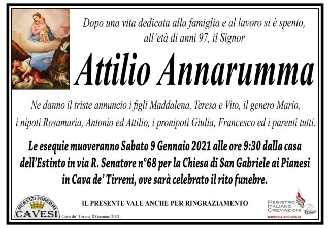 Le esequie muoveranno domani sabato 9 gennaio, alle ore 9,30, dalla casa dell’Estinto in via R. Senatore n°68 per la Chiesa di San Gabriele ai Pianesi in Cava de’ Tirreni, dove sarà celebrato il rito funebre.