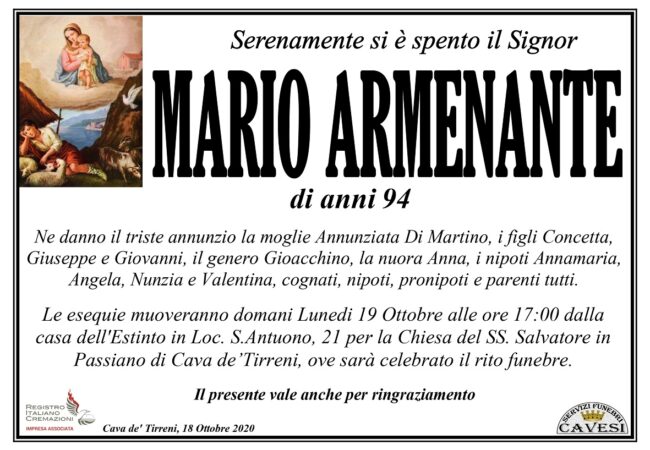 Le esequie muoveranno oggi, lunedì 19 ottobre, alle ore 17, dalla casa dell’Estinto in Loc. S. Antuono, 21, per la Chiesa del SS. Salvatore in Passiano di Cava de’Tirreni, ove sarà celebrato il rito funebre.