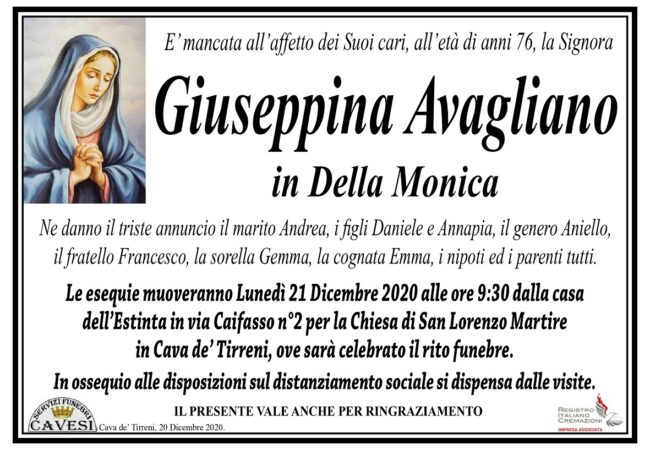 E’ mancata all’affetto dei Suoi cari, all’età di anni 76, la Signora Giuseppina Avagliano in Della Monica.