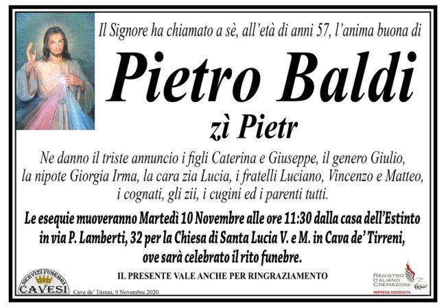 Le esequie muoveranno domani, martedì 10 novembre, alle ore 11,30 dalla casa dell’Estinto in via P. Lamberti, 32 per la Chiesa di Santa Lucia V. e M. in Cava de’ Tirreni, dove sarà celebrato il rito funebre.