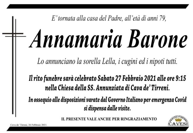Il rito funebre sarà celebrato domani, sabato 27 febbraio, alle ore 9,15, nella Chiesa della SS. Annunziata di Cava de’ Tirreni.