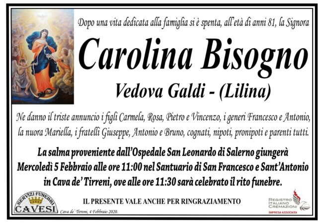 Dopo una vita dedicata alla famiglia si è spenta, all’età di 81 anni, la Signora Carolina (Lilina) Bisogno, vedova Galdi.