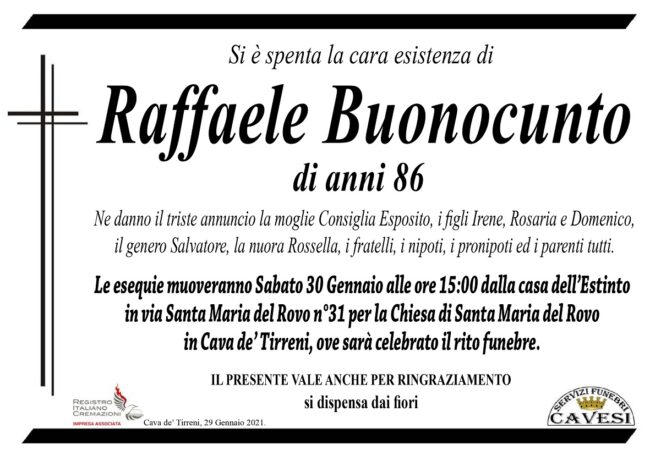 Le esequie muoveranno domani, sabato 30 gennaio, alle ore 15, dalla casa dell’Estinto in via Santa Maria del Rovo n. 31 per la Chiesa di Santa Maria del Rovo in Cava de’ Tirreni, ove sarà celebrato il rito funebre.