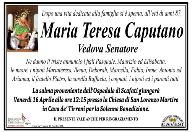 Dopo una vita dedicata alla famiglia si è spenta, all’età di anni 87, Maria Teresa Caputano, Vedova Senatore.
