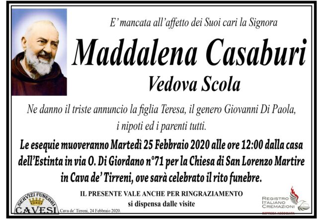 Le esequie muoveranno stamani, martedì 25 febbraio, alle ore 12, dalla casa dell’Estinta in via O. Di Giordano, n. 71, per la Chiesa di San Lorenzo Martire in Cava de’ Tirreni, ove sarà celebrato il rito funebre.