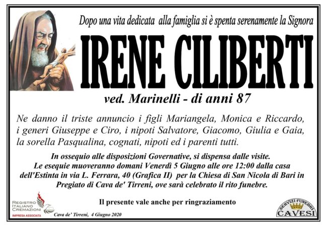 Le esequie muoveranno domani, venerdì 5 giugno, alle ore 12, dalla casa dell’Estinta in via L. Ferrara, 40 (Grafica II) per la Chiesa di San Nicola di Bari in Pregiato di Cava de’ Tirreni, ove sarà celebrato il rito funebre.