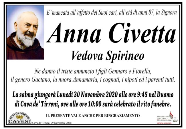 E’ mancata all’affetto dei Suoi cari, all’età di anni 87, la Signora Anna Civetta, vedova Spirineo.