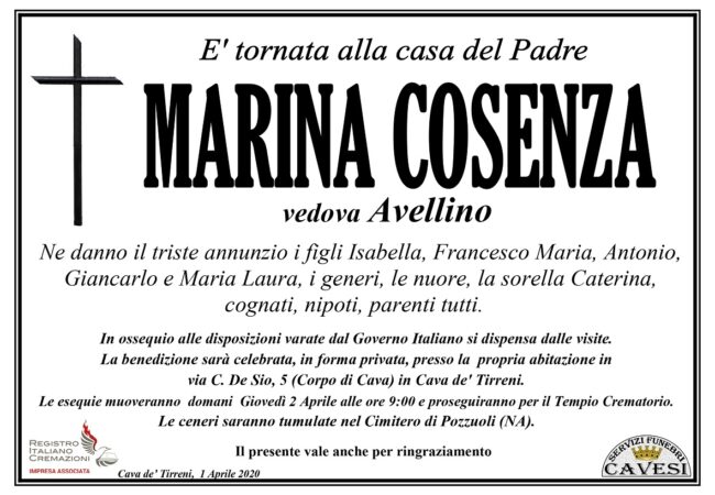 E’ tornata alla casa del Padre, la signora Marina Cosenza, vedova Avellino.