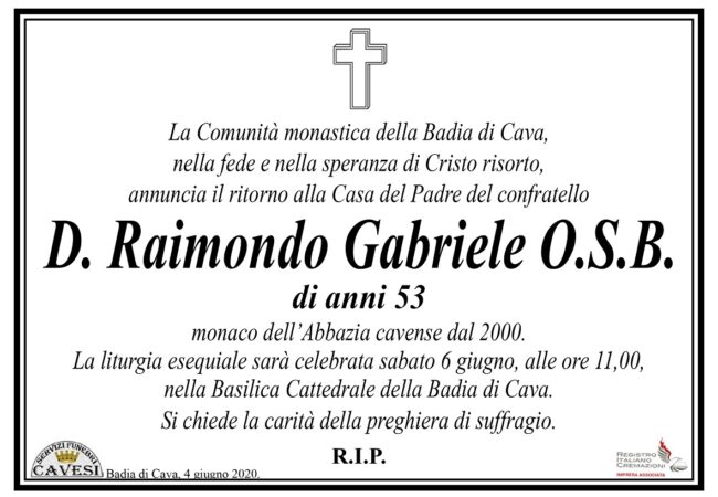 La Comunità monastica della Badia di Cava, nella fede e nella speranza di Cristo risorto, annuncia il ritorno alla Casa del Padre del confratello D. Raimondo Gabriele O.S.B. di anni 53, monaco dell’Abbazia cavense dal 2000.