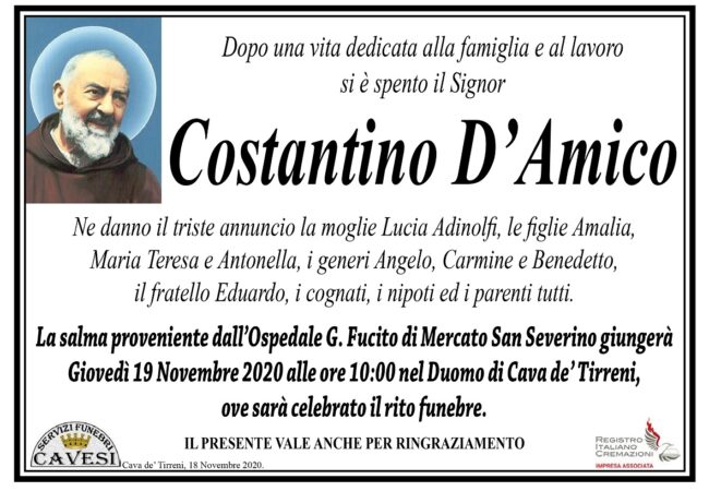 Ne danno il triste annuncio la moglie Lucia Adinolfi, le figlie Amalia, Maria Teresa e Antonella, i generi Angelo, Carmine e Benedetto, il fratello Eduardo, i cognati, i nipoti ed i parenti tutti.