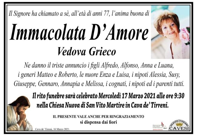 Il Signore ha chiamato a sè, all’età di anni 77, l’anima buona di Immacolata D’Amore, vedova Grieco.