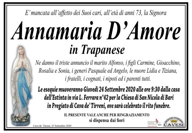 E’ mancata all’affetto dei Suoi cari, all’età di anni 73, la Signora Annamaria D’Amore in Trapanese.