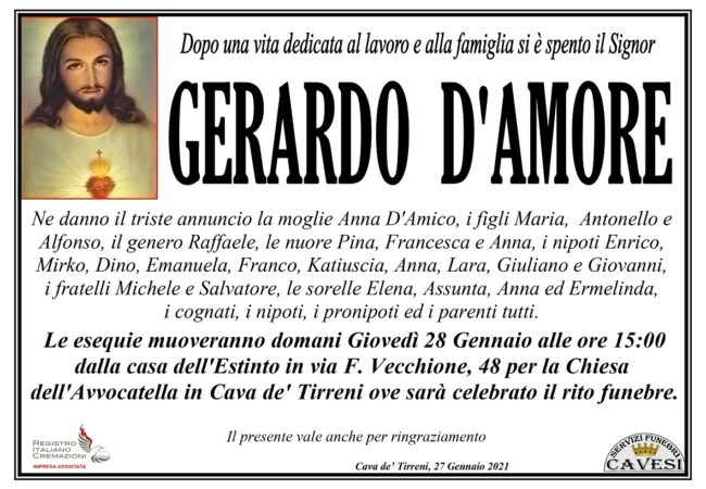 Le esequie muoveranno oggi pomeriggio, giovedì 28 gennaio, alle ore 15, dalla casa dell’Estinto in via F. Vecchione, 48 per la Chiesa dell’Avvocatella in Cava de’ Tirreni, dove sarà celebrato il rito funebre.