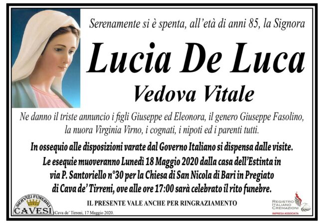 Le esequie muoveranno oggi, lunedì 18 maggio, dalla casa dell’Estinta, in via P. Santoriello, n. 30, per la Chiesa di San Nicola di Bari in Pregiato di Cava de’ Tirreni, dove alle ore 17 sarà celebrato il rito funebre.