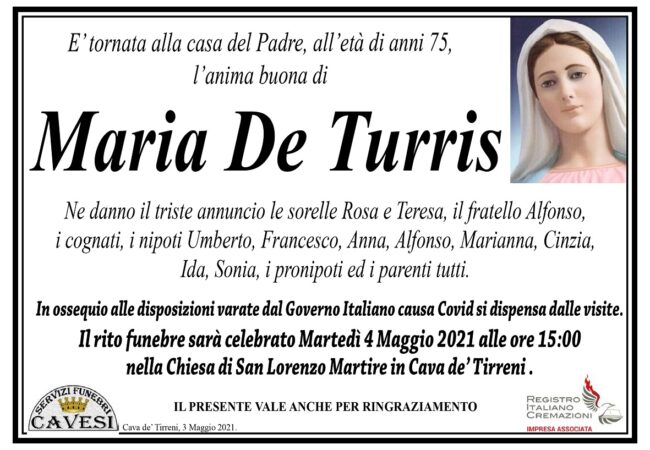 Il rito funebre sarà celebrato stamani, martedì 4 maggio, alle ore 15, nella Chiesa di San Lorenzo Martire in Cava de’ Tirreni.