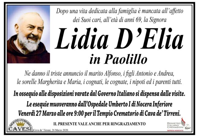 Dopo una vita dedicata alla famiglia è mancata all’affetto dei Suoi cari, all’età di 69 anni, la Signora Lidia D’Elia in Paolillo.