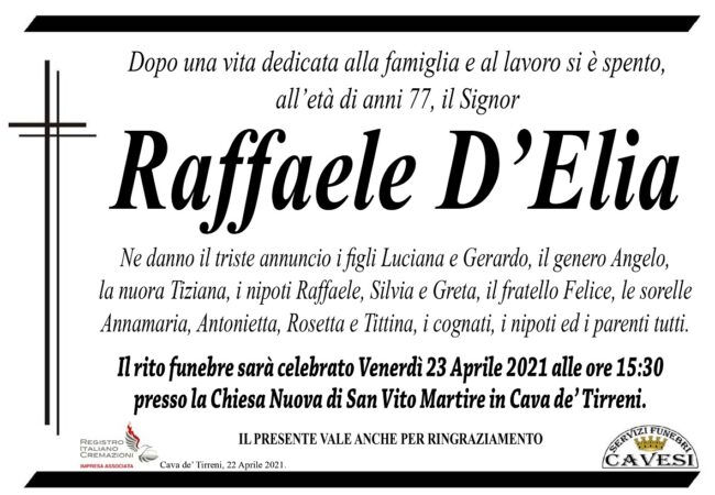 Il rito funebre sarà celebrato oggi pomeriggio, venerdì 23 aprile 2021, alle ore 15.30 presso la Chiesa Nuova di San Vito Martire in Cava de’ Tirreni.