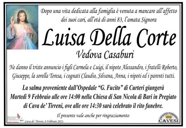 Dopo una vita dedicata alla famiglia è venuta a mancare all’affetto dei suoi cari, all’età di anni 83, l’amata Signora Luisa Della Corte vedova Casaburi.