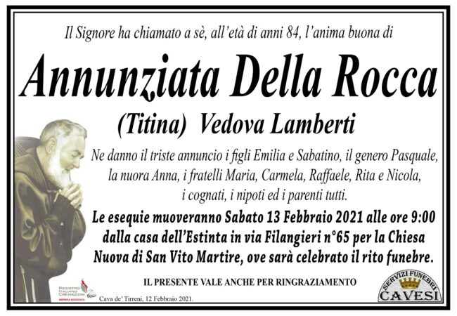 Il Signore ha chiamato a sé, all’età di anni 84, l’anima buona di Annunziata Della Rocca (Titina) vedova Lamberti.