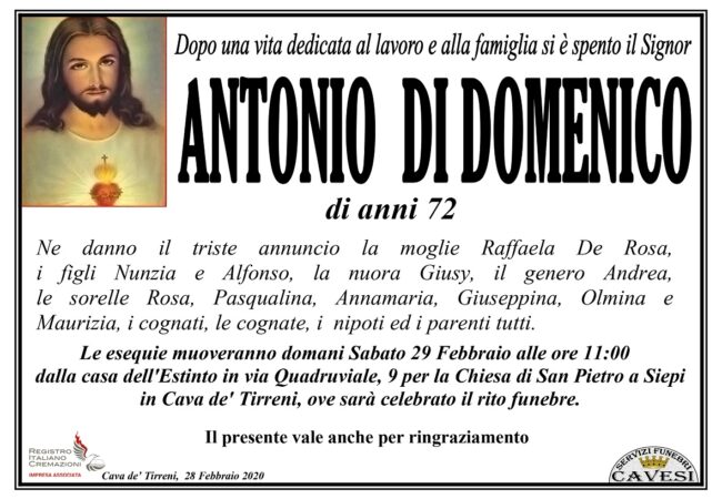 Le esequie muoveranno stamani, sabato 29 febbraio, alle ore 11, dalla casa dell’Estinto in via Quadruviale, 9, per la Chiesa di San Pietro a Siepi in Cava de’ Tirreni, dove sarà celebrato il rito funebre.