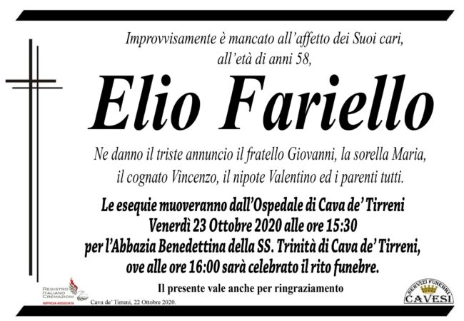 Improvvisamente è mancato all’affetto dei Suoi cari, all’età di anni 58, Elio Fariello.