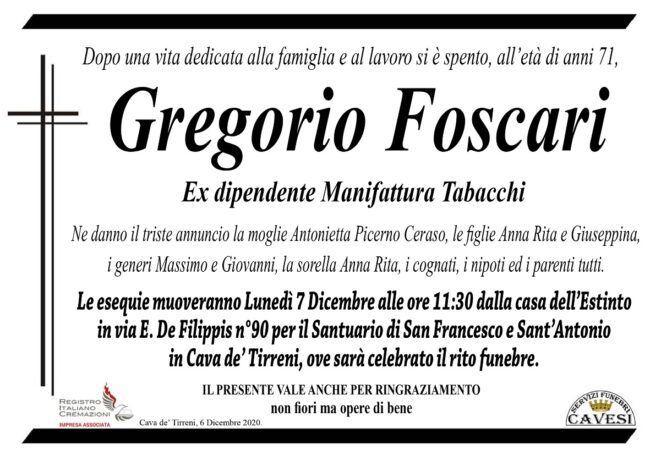 Dopo una vita dedicata alla famiglia e al lavoro si è spento, all’età di anni 71, Gregorio Foscari, ex dipendente Manifattura Tabacchi