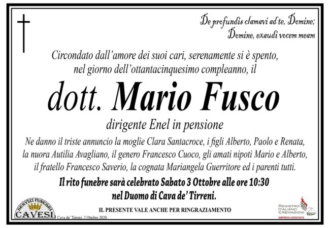 Circondato dall’amore dei suoi cari, serenamente si è spento, nel giorno dell’ottantacinquesimo compleanno, il dott. Mario Fusco, dirigente Enel in pensione.