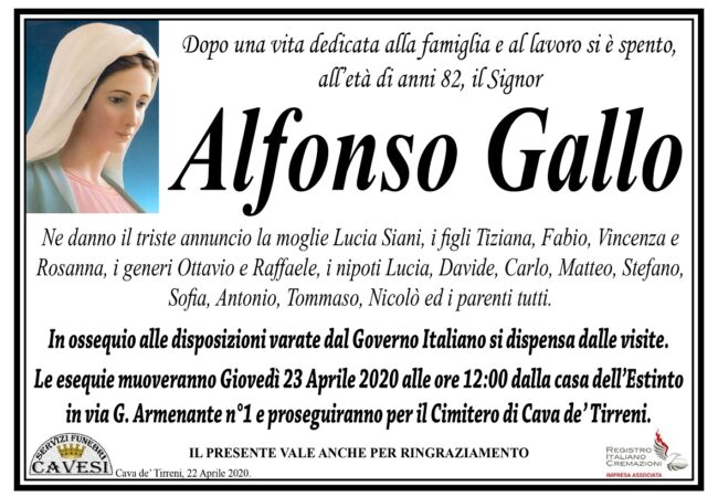 Le esequie muoveranno domani, giovedì 23 aprile, alle ore 12, dalla casa dell’Estinto in via G. Armenante, n. 1, e proseguiranno per il Cimitero di Cava de’ Tirreni.